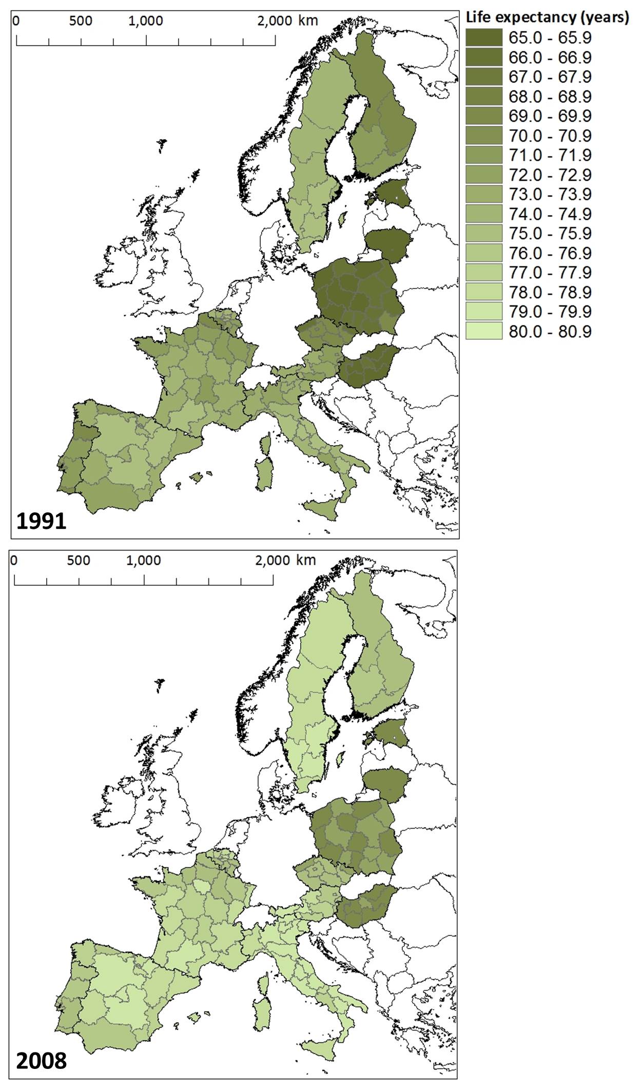 Figure: Male life expectancy in 1991 (top) and 2008 (bottom) in the 129 regions in our study. Data sources: GISCO and Eurostat database.