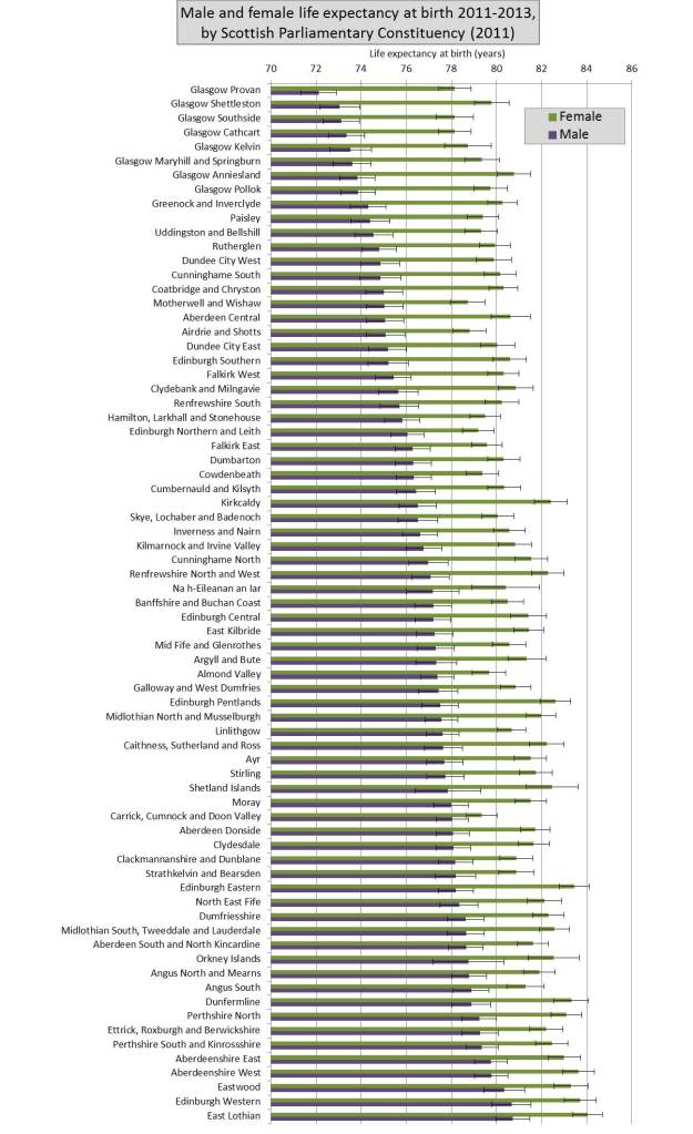 New life expectancy at birth figures for 2011-2013 for Scottish Parliamentary Constituencies have just been released by National Records of Scotland (NRS). We’ve mapped and graphed these data to illustrate the latest geographical patterns of mortality in Scotland. Parliamentary constituencies contain roughly equal populations and split urban centres so are useful for comparison of life expectancy both within cities and between urban and rural areas. The life expectancy figures indicate the average number of years a baby born in 2011-2013 would live if he/she was subject to the same 2011-2013 death rates (age- and sex-specific) throughout his/her lifetime.