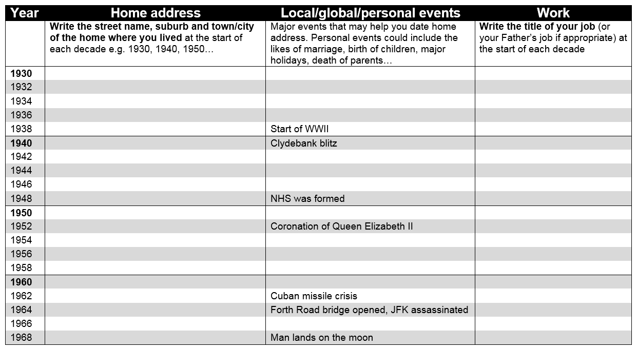 So, how to work out where the cohort participants lived throughout their lives? From the LBC1936 surveys we know the address of the participants at age 11 and in subsequent waves but there is a 60+ year gap where their home address details are unknown. This is an example of a problem faced by many studies that follow people over time where it is almost inevitable that research interests and priorities change and evolve and new data is required. Our study needs residential addresses so we can spatially link the participants to the various longitudinal environmental measures that we are reconstructing from archive material. We used the ‘life grid method’ as an aid to help the participants recall their residential addresses with the goal of collecting at least one address for every decade. It’s based on the premise that notable global, local and personal events can be used to help people order their thoughts and jog memories e.g. “where did you live when Princess Diana died?” Below is an excerpt from the life grid we developed to collect home address and occupation details from the cohort participants. Occupational histories might provide further insights into health behaviours, outcomes and personal trajectories of the participants. We are currently transcribing and geocoding the life grids but so far there seems to be few instances of missing data which we see as a success of the method chosen to elucidate these details. We see the life grid as an effective method that other researchers could use to retrospectively collect data from cohort participants.