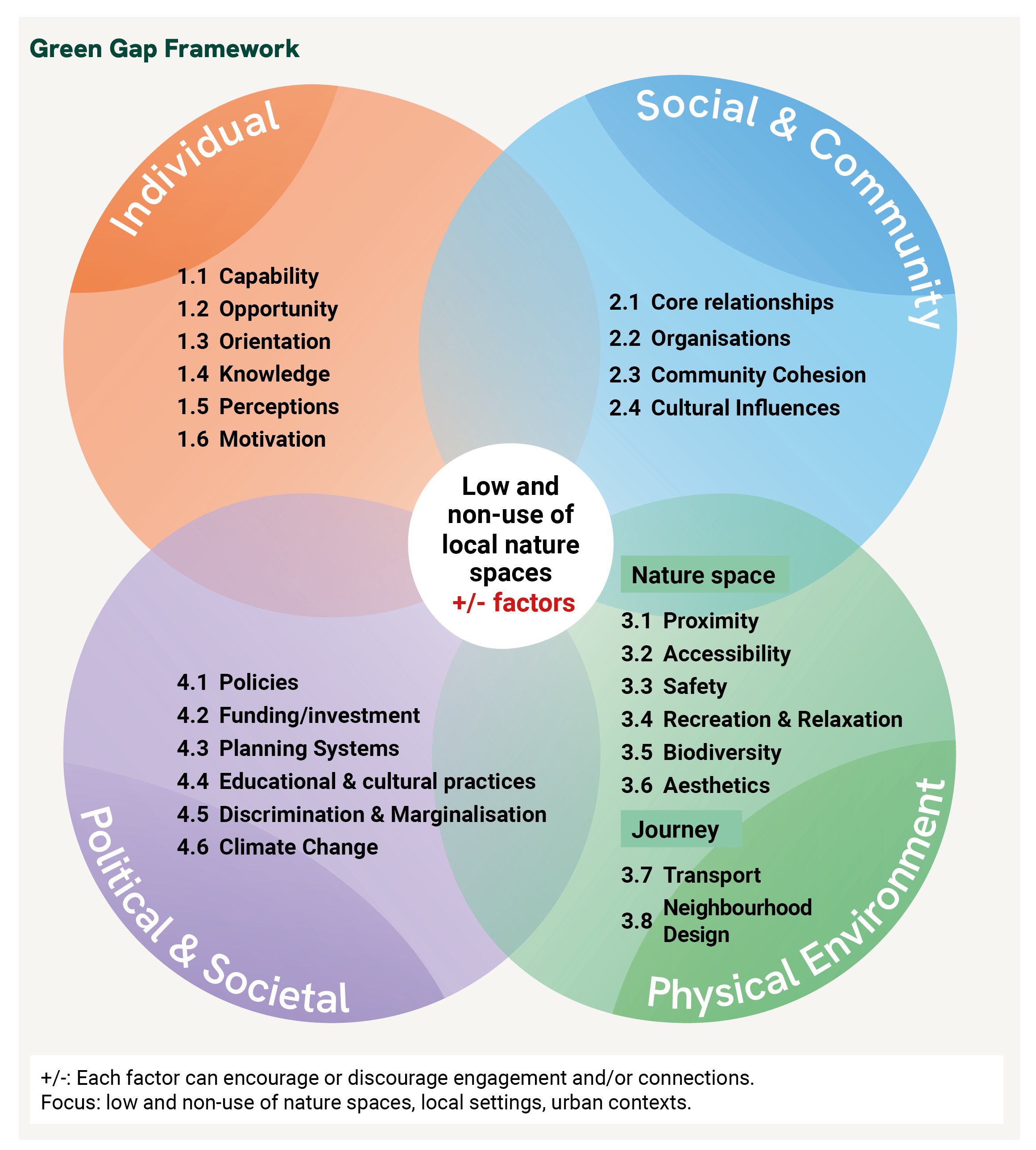 Each factor in the framework is marked with a +/− symbol to reflect an important insight: the same factor that enables one person to use a green space may be the very thing that prevents another. Dogs in a park are a draw for some visitors and a deterrent for others. A park that feels safely secluded to one person may feel isolated and threatening to another.