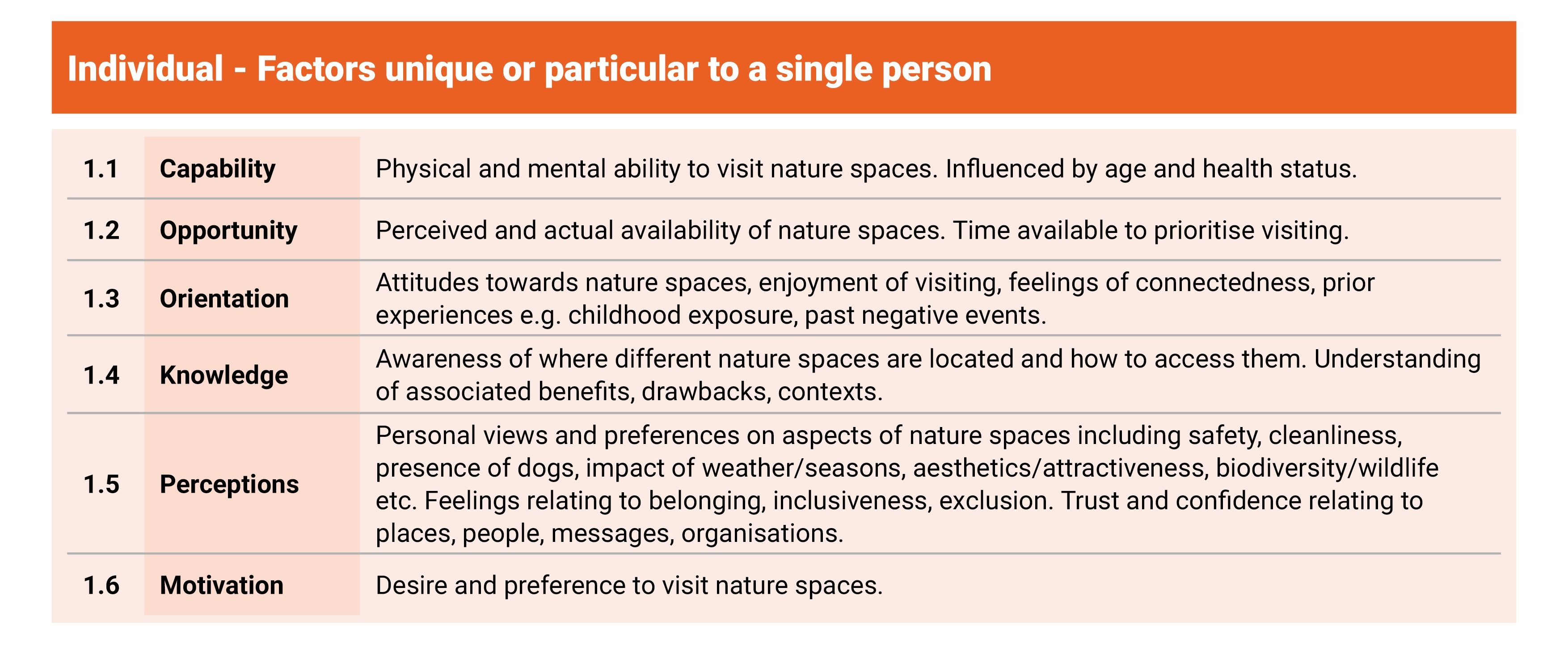 Domain 1 – Individual. This covers the factors unique to a person: their physical and mental capability to visit, the time and opportunity they have, their knowledge of what’s nearby, their attitudes and prior experiences, and  – crucially – their motivation or lack of it.