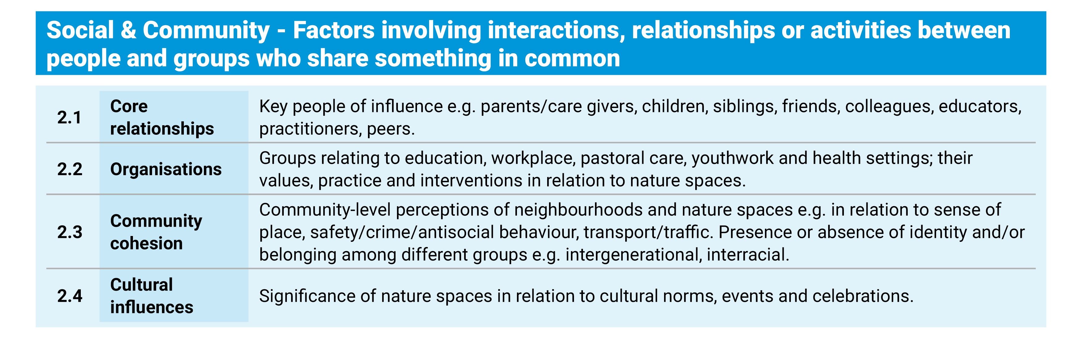 Domain 2 – Social and Community. Whether or not someone visits a green space is also shaped by the people and groups around them; family members and friends who model or discourage outdoor habits, community organisations, schools and employers, the cohesion and perceived safety of a neighbourhood, and the cultural significance (or absence) of green spaces in someone’s background.