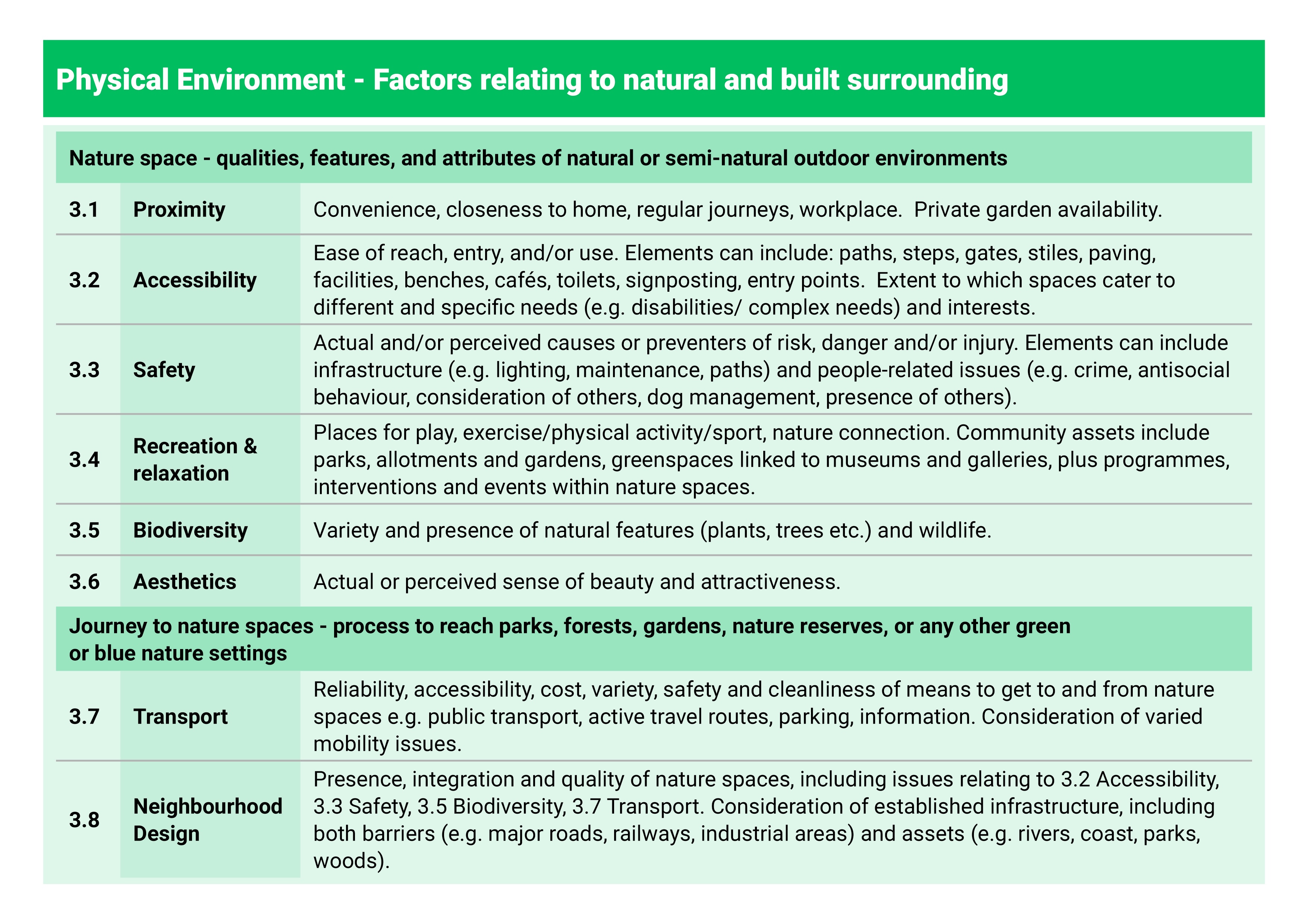 Domain 3 – Physical Environment. This is where most existing policy and research has focused; the characteristics of green spaces themselves (proximity, accessibility, safety, aesthetics, biodiversity, facilities for recreation) as well as the journey to get there (transport links, neighbourhood design, roads and infrastructure). These factors matter enormously, but they’re not the whole story.