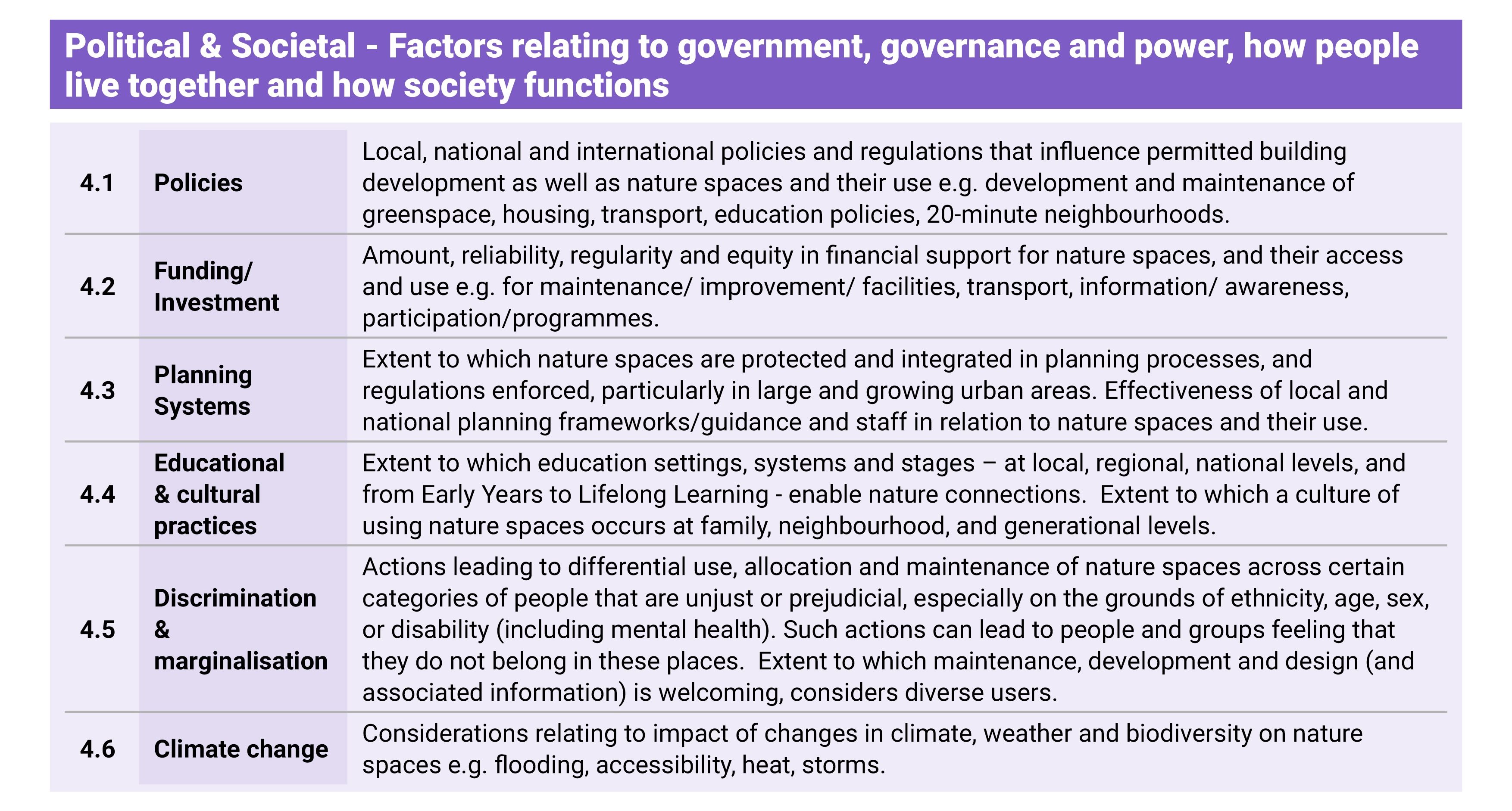 Domain 4 – Political and Societal. Perhaps the most overlooked domain: the policies, funding decisions, planning systems and cultural practices that shape which communities have well-maintained, welcoming green spaces and which do not. This domain also considers discrimination and marginalisation, and the impacts of climate change.
