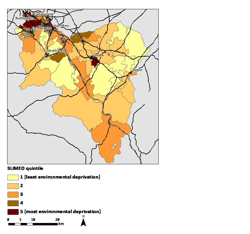 Thanks for your enquiry. It might be better to discuss this by email (you can find my email address from the link on our ‘People’ page). I can then send you the report and put you in touch with the council department that commissioned the work. But having a quick look at how Lanark fares in the SLIMED ratings shows me that 4 of Lanark’s 11 data zones have a high level of environmental deprivation (relative to the South Lanarkshire average). In other words they’re among the 20% of South Lanarkshire’s neighbourhoods that have the worst quality environments. Another 4 data zones are classed in the next highest level (21-40%). So most of Lanark’s neighbourhoods have higher than average levels of environmental deprivation. I think this would make a useful addition to your application, as funding to improve the environment in ways that could potentially benefit health would be really valuable.